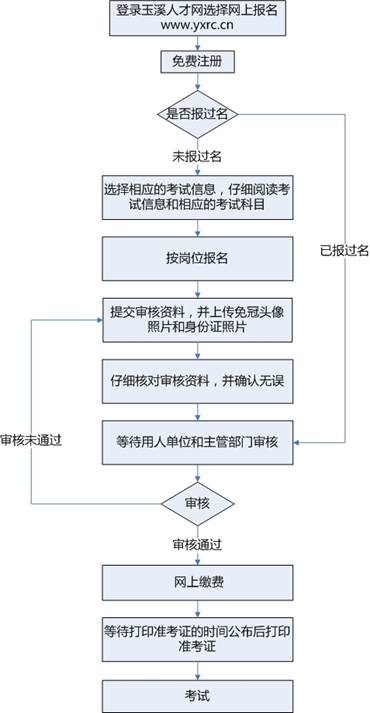 網(wǎng)絡(luò)報名的大致流程為:登錄玉溪人才網(wǎng)→網(wǎng)上報名入口→注冊→查看招聘崗位→按崗位報名并填寫報名資料→等待審核→審核通過→網(wǎng)上交費(注意查看交費狀態(tài),確認交費成功)→打印筆試準考證(打印時間在筆試公告內(nèi)另行通知)→參加筆試。