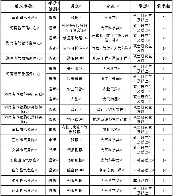 海南省氣象局為中國氣象局垂直管理單位,是海南省主管全省氣象行業(yè)工作的正廳級財政預(yù)算事業(yè)單位。因工作需要,決定面向社會招聘近3年(2013-2015年)畢業(yè)的全日制大學(xué)本科以上學(xué)歷工作人員20名,現(xiàn)將招聘有關(guān)事項公告如下: