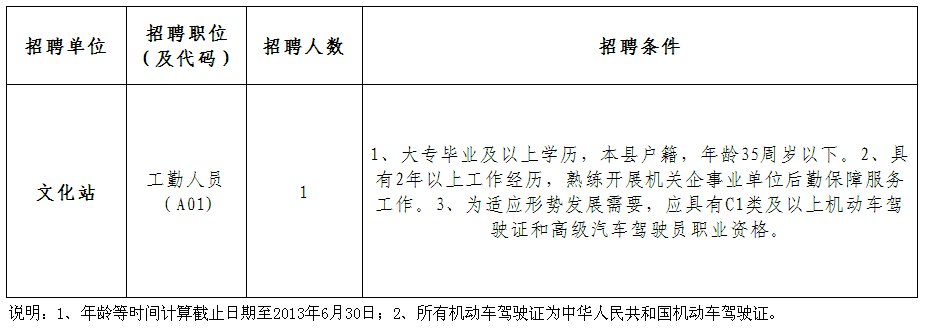 除上述基本條件外,擬招聘崗位具體條件見《龍門縣龍?zhí)舵?zhèn)文化站2013年公開招聘工作人員職位表》(附表)。