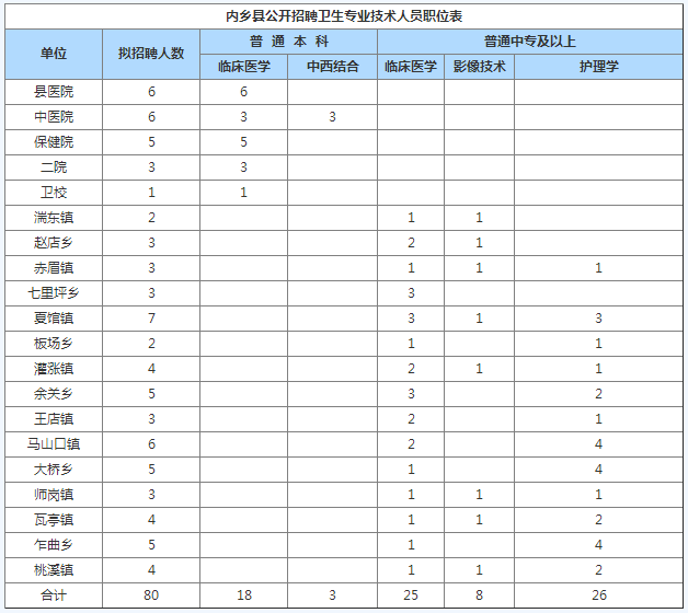 本次招聘衛(wèi)生專業(yè)技術人員80名,其中:臨床醫(yī)學43人、中西醫(yī)結合3人、影像醫(yī)學8人、護理26人(詳情見《招聘職位表》)