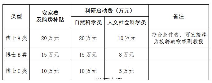 根據(jù)引進(jìn)博士的類型和層次的不同,分別對應(yīng)下表享受有關(guān)待遇: