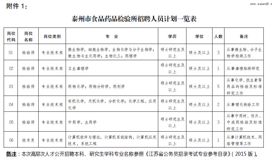 泰州市食品藥品檢驗所系泰州市食品藥品監(jiān)督管理局下屬全額撥款事業(yè)單位,現(xiàn)面向社會招聘15名全日制普通高校畢業(yè)碩士及以上研究生,具體崗位、專業(yè)、學(xué)歷、學(xué)位等要求詳見招聘人員計劃一覽表(附件1)。