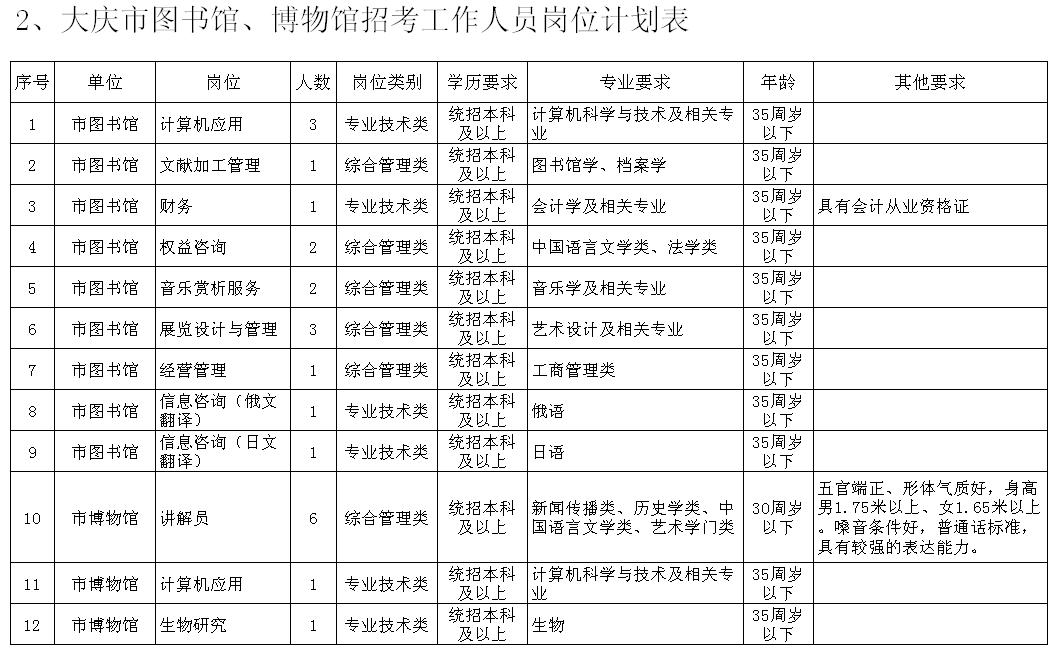 根據(jù)工作需要和用人單位編制空缺情況,經(jīng)市政府研究決定,大慶市圖書館、博物館公開招考工作人員,F(xiàn)將有關(guān)事項公告如下: