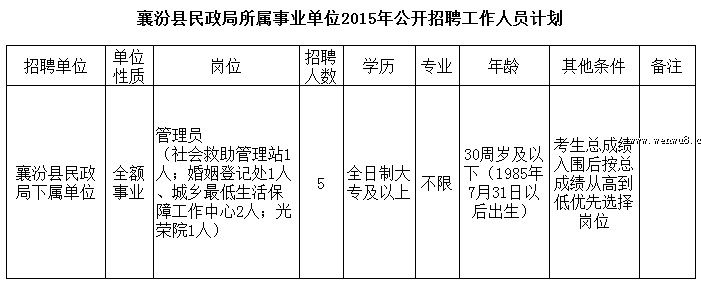 本次共招聘襄汾縣民政局所屬事業(yè)單位工作人員5名(詳見2015年襄汾縣民政局所屬事業(yè)單位公開招聘工作人員計劃表)