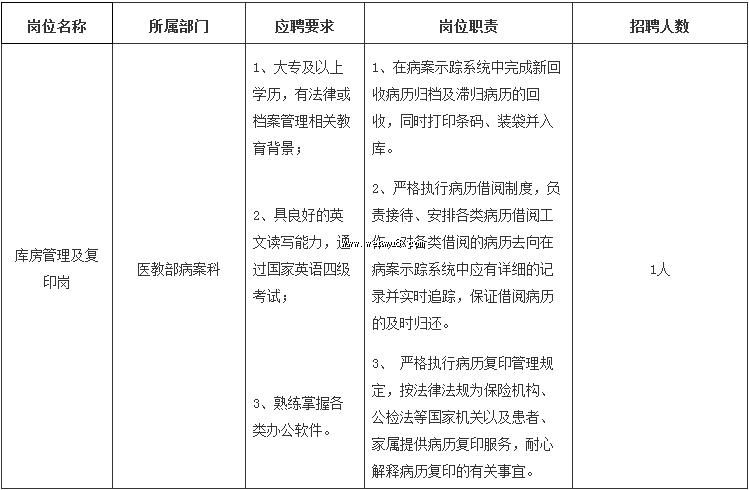| 我院病案科因工作需要,現(xiàn)面向社會公開招聘1名庫房管理及復印人員,詳情如下: