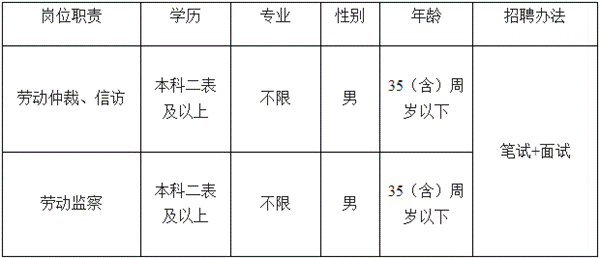招聘社會化用工專業(yè)勞動仲裁、信訪崗位1人,勞動監(jiān)察、勞動關(guān)系崗位1人。