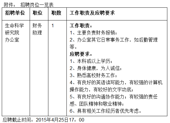 本單位擬公開(kāi)招聘員工 1 名,派遣至浙江大學(xué)生命科學(xué)研究院從事相關(guān)崗位工作,招聘將堅(jiān)持公開(kāi)、公平、競(jìng)爭(zhēng)、擇優(yōu)的原則,凡符合招聘崗位要求且有意向者,請(qǐng)將個(gè)人簡(jiǎn)歷(包括學(xué)習(xí)、工作經(jīng)歷)以及其它證明材料發(fā)至lsi@zju.edu.cn郵箱。經(jīng)考核后擇優(yōu)錄取,具體招聘崗位及要求詳見(jiàn)附件。
