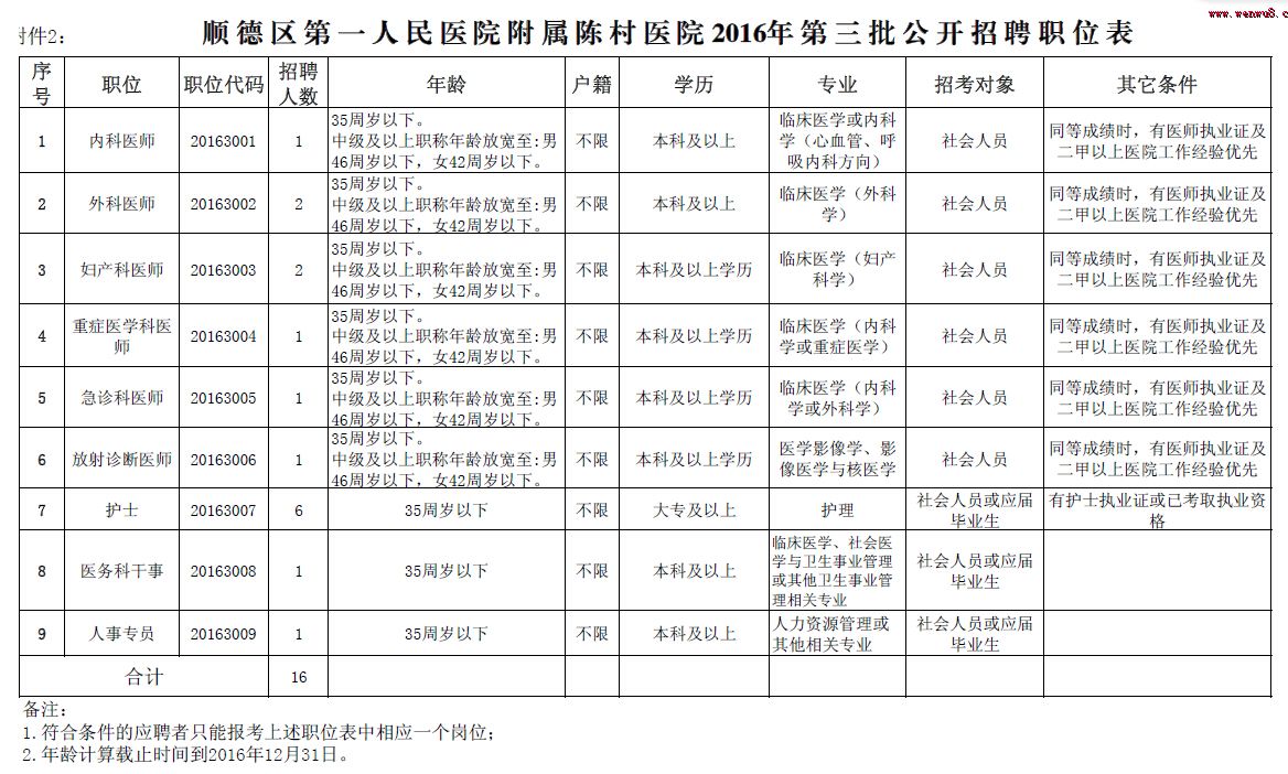 (三)報名方式及要求:本次招聘采取現(xiàn)場或郵寄材料兩種方式報名。應(yīng)聘者須提供報名表、就業(yè)推薦表(應(yīng)屆畢業(yè)生提供)、 居民身份證、戶口薄、各層次學(xué)歷學(xué)位證書及資格證、執(zhí)業(yè)證等相關(guān)材料原件及復(fù)印件及近期正面免冠一寸彩照4張。應(yīng)聘者可從網(wǎng)站下載并填寫《順德區(qū)第一人民醫(yī)院附屬陳村醫(yī)院公開招聘人員報名表》(附件2,請貼一寸彩照)。