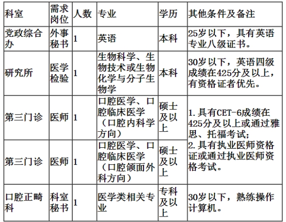 昆明醫(yī)科大學(xué)附屬口腔醫(yī)院(云南省口腔醫(yī)院)是云南省規(guī)模最大、設(shè)備最先進(jìn)、技術(shù)力量最雄厚的三級口腔?漆t(yī)院,因醫(yī)療業(yè)務(wù)發(fā)展需要,特向社會(huì)誠聘工作人員,現(xiàn)將有關(guān)事項(xiàng)告示如下: