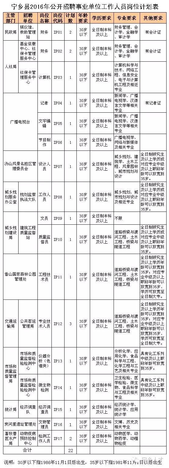 本次招聘事業(yè)單位工作人員共計22名,具體招聘單位、招聘崗位、招聘人數(shù)詳見如下《寧鄉(xiāng)縣2016年公開招聘事業(yè)單位工作人員崗位計劃表》。