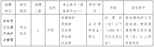 海南省人力資源和社會保障廳海南省群眾藝術(shù)館(加掛省藝術(shù)研究所、省非物質(zhì)文化遺產(chǎn)保護(hù)中心),是海南省文化廣電出版體育廳直屬公益一類事業(yè)單位,位于海南省?谑校瑥氖氯罕娢幕囆g(shù)和非物質(zhì)文化遺產(chǎn)保護(hù)工作。根據(jù)《海南省事業(yè)單位公開招聘人員實(shí)施辦法》規(guī)定,經(jīng)海南省政府相關(guān)部門審核同意,我館公開招聘事業(yè)編制專業(yè)技術(shù)人員1名,F(xiàn)將有關(guān)事項(xiàng)公告如下: