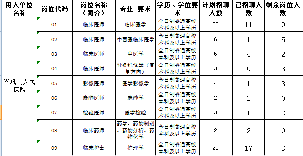 根據(jù)《岑鞏縣人民醫(yī)院公開招聘66名向社會購買服務編制人員實施方案》要求,我院公開招聘66名向社會購買服務編制人員在貴州醫(yī)科大學、遵義醫(yī)學院考點報名、資格初審和考試工作已于2017年3月21日結束,經(jīng)公開招聘66名向社會購買服務編制人員評審小組評審,確定39位同志為聘用對象,F(xiàn)將各崗位在貴州醫(yī)科大學、遵義醫(yī)學院考點已聘用人數(shù)和剩余崗位公布如下: