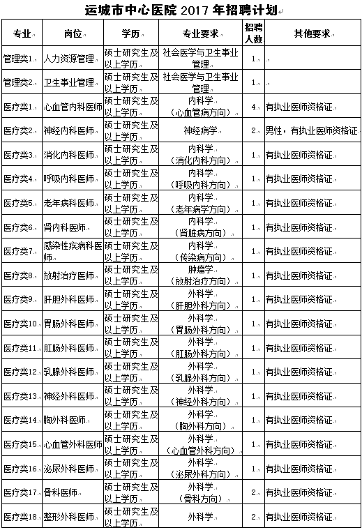 為落實(shí)人才強(qiáng)院戰(zhàn)略,根據(jù)工作需要,經(jīng)研究,運(yùn)城市中心醫(yī)院2017年面向社會(huì)公開招聘工作人員160名,現(xiàn)公告如下:
