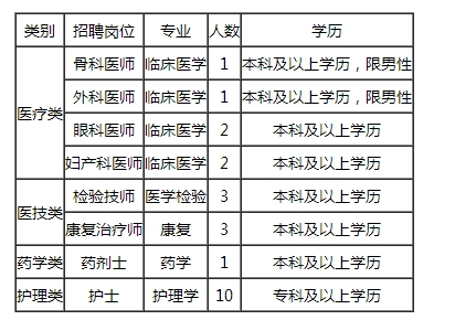 (一)人數(shù)和專業(yè):共招聘工作人員23名,其中醫(yī)療類6名,醫(yī)技類6名,藥學(xué)類1名,護(hù)理類10名。