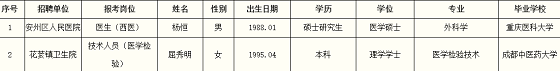 根據《綿陽市安州區(qū)人力資源和社會保障局關于2021年下半年考核招聘事業(yè)單位專業(yè)技術人員的公告》規(guī)定,經考核、體檢、考察,現將第二批擬聘人員名單公示如下。