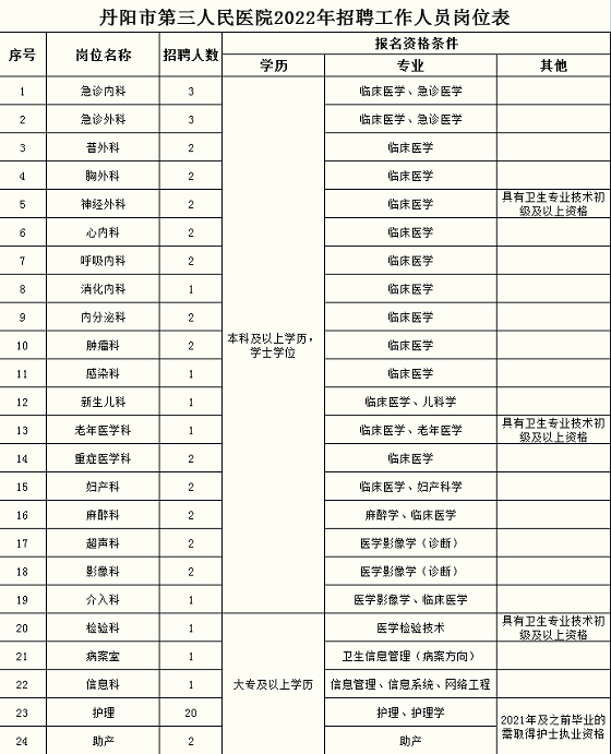 7、招聘崗位、人數(shù)和所要求的學(xué)歷、專業(yè)等資格條件詳見(jiàn)《丹陽(yáng)市第三人民醫(yī)院2022年招聘工作人員崗位表》。