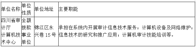 根據(jù)《事業(yè)單位人事管理條例》、《事業(yè)單位公開招聘人員暫行規(guī)定》和《四川省省屬事業(yè)單位公開招聘工作人員實施細則(試行)》等有關(guān)規(guī)定,我廳擬面向社會公開招聘部分工作人員補充到直屬事業(yè)單位四川省審計廳計算機技術(shù)中心工作,F(xiàn)將公開招聘有關(guān)事項公告如下(本公告由我廳同時在四川省人力資源和社會保障廳官網(wǎng)[rst.sc.gov.cn,下同]“人事考試”專欄和四川省審計廳官網(wǎng)[sjt.sc.gov.cn,下同]上發(fā)布)。