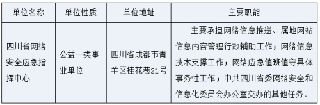 根據(jù)《事業(yè)單位人事管理條例》、《事業(yè)單位公開招聘人員暫行規(guī)定》和《四川省省屬事業(yè)單位公開招聘工作人員實施細則(試行)》等有關規(guī)定,中共四川省委網(wǎng)絡安全和信息化委員會辦公室(以下簡稱“省委網(wǎng)信辦”)擬面向社會公開招聘部分工作人員補充到四川省網(wǎng)絡安全應急指揮中心工作。現(xiàn)將公開招聘有關事項公告如下(本公告由省委網(wǎng)信辦在四川省人力資源和社會保障廳官網(wǎng)[rst.sc.gov.cn,下同]“人事考試”專欄上發(fā)布)。