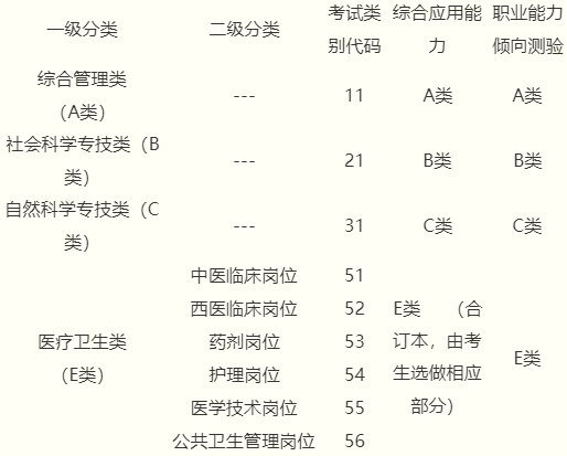 筆試科目為《綜合應用能力》和《職業(yè)能力傾向測驗》兩科,每科分值為150分。按分類進行考試,不同類別的考試使用不同的試題?荚囶悇e分為綜合管理類(A類)、社會科學專技類(B類)、自然科學專技類(C類)和醫(yī)療衛(wèi)生類(E類)四類。