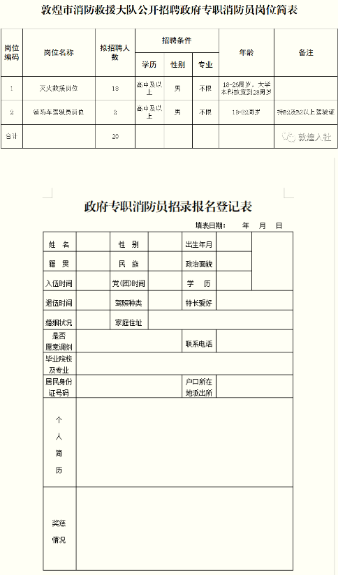 此次計劃招聘政府專職消防員20名(滅火救援崗位18名,消防車駕駛員崗位2名),具體計劃詳見《敦煌市消防救援大隊公開招聘政府專職消防員崗位簡表》。