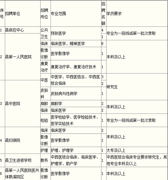 因醫(yī)療衛(wèi)生事業(yè)發(fā)展需要,擬面向全日制普通高校公開招聘事業(yè)編制中醫(yī)學(xué)、預(yù)防醫(yī)學(xué)、臨床醫(yī)學(xué)、醫(yī)學(xué)影像學(xué)等專業(yè)工作人員32名,有關(guān)事項(xiàng)公告如下: