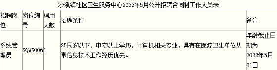 附件:沙溪鎮(zhèn)社區(qū)衛(wèi)生服務(wù)中心2022年5月公開招聘合同制工作人員表