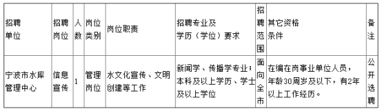 因工作需要,寧波市水利局直屬事業(yè)單位寧波市水庫(kù)管理中心擬面向全市公開(kāi)選聘事業(yè)編制工作人員1名,現(xiàn)就有關(guān)事項(xiàng)公告如下: