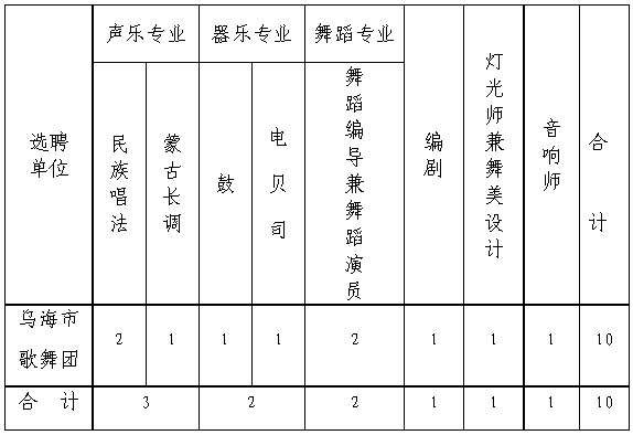 為了加快烏海文化事業(yè)的發(fā)展,進(jìn)一步優(yōu)化市歌舞團(tuán)藝術(shù)專業(yè)隊(duì)伍結(jié)構(gòu),提高整體專業(yè)水平,現(xiàn)決定公開(kāi)選聘10名專業(yè)人員。