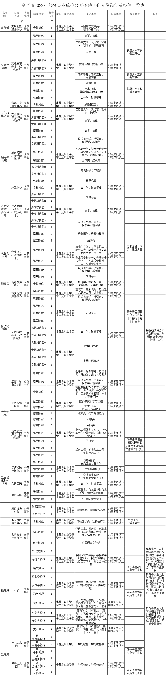 本次共招聘事業(yè)單位工作人員159名,其中教育系統(tǒng)62名,其他事業(yè)單位97名。具體崗位及要求詳見《高平市2022年部分事業(yè)單位公開招聘工作人員崗位及條件一覽表》(附件1)。