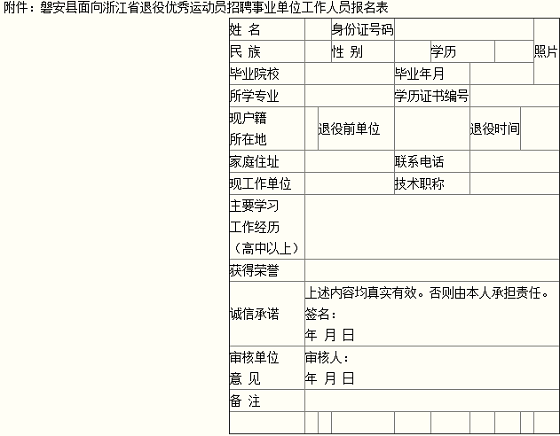 (1)《磐安縣面向浙江省退役優(yōu)秀運(yùn)動(dòng)員招聘事業(yè)人員報(bào)名表》1份(附件1);