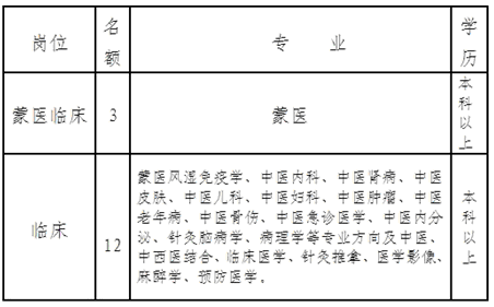 根據(jù)事業(yè)發(fā)展需要,決定2013年為市蒙中醫(yī)院公開招聘醫(yī)務(wù)人員15名,F(xiàn)公告如下:
