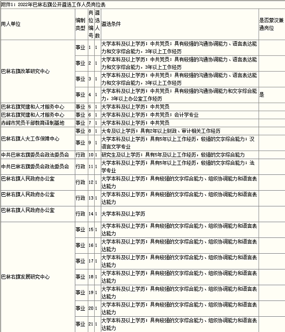 附件1:2022年巴林右旗公開遴選工作人員崗位表定.xlsx