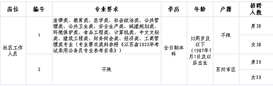 3.年齡在35周歲及以下(1987年7月1日及以后出生),唯亭戶籍的退役軍人,以及中共黨員(含預(yù)備)、持有社會(huì)工作職業(yè)資格證書者、有2年以上社區(qū)工作經(jīng)驗(yàn)的唯亭戶籍居民,學(xué)歷要求可放寬至全日制大專、年齡要求可放寬至40周歲(1982年7月1日及以后出生)。