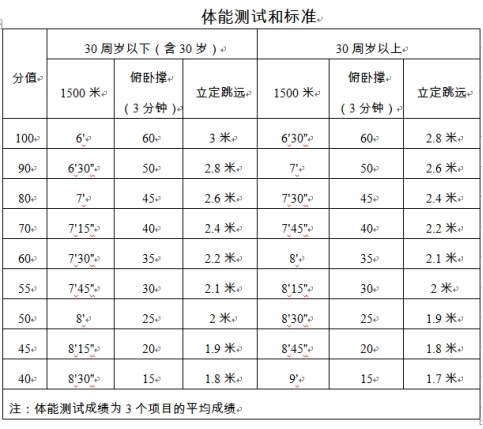 (2)體能測試滿分100分,達到60分合格,不滿60分取消資格。得分按比例折算入總成績。