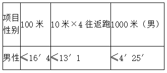2.合同制司法警察體能測試:測試項(xiàng)目為100米跑、10米×4往返跑和1000米跑(男性)。體能測試設(shè)達(dá)標(biāo)和不達(dá)標(biāo),達(dá)標(biāo)標(biāo)準(zhǔn)為: