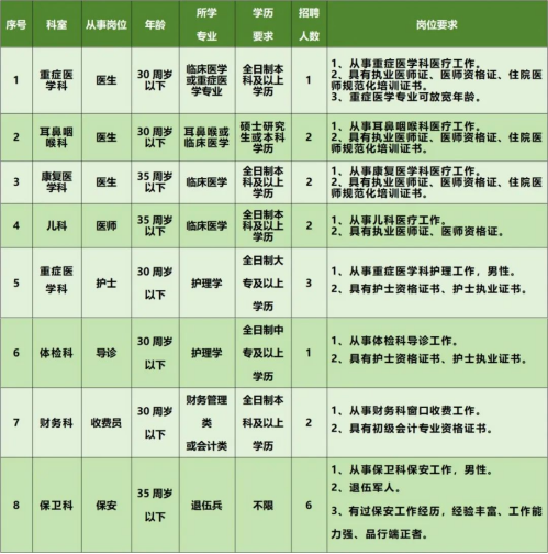 根據(jù)醫(yī)院發(fā)展需要及科室用人需求,現(xiàn)面向社會招聘工作人員,具體要求如下: