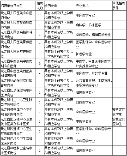 本次參加招聘的單位為元江縣人民醫(yī)院、元江縣中醫(yī)醫(yī)院、元江縣婦幼保健院、元江縣甘莊中心衛(wèi)生院、元江縣曼來鎮(zhèn)中心衛(wèi)生院、元江縣因遠鎮(zhèn)中心衛(wèi)生院、元江縣洼垤鄉(xiāng)衛(wèi)生院、元江縣咪哩鄉(xiāng)衛(wèi)生院。