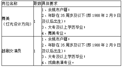因工作需要,余姚市姚劇保護(hù)傳承中心決定面向社會(huì)公開(kāi)招聘編外工作人員2名,現(xiàn)將有關(guān)招聘條件及要求公告如下: