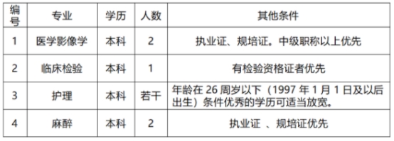 5、第一學歷為統(tǒng)招的全日制本科畢業(yè)生,已取得相應學歷、學位,具備崗位要求的相關資格證、執(zhí)業(yè)證,護理專業(yè)條件優(yōu)秀的學歷可適當放寬。