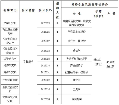 為進一步改善安徽省社會科學(xué)院(以下簡稱“省社科院”)人才隊伍結(jié)構(gòu),根據(jù)《安徽省事業(yè)單位公開招聘人員暫行辦法》(皖人社發(fā)〔2010〕78號)等有關(guān)文件要求,現(xiàn)就省社科院2023年面向社會引進高層次專業(yè)技術(shù)人才制定本實施方案。