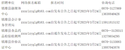 鎮(zhèn)雄縣融媒體中心2名,鎮(zhèn)雄縣會計事務管理局2名,鎮(zhèn)雄縣食品藥品檢驗檢測所1名,鎮(zhèn)雄縣價格認證中心1名。招聘崗位及招聘條件詳見《昭通市鎮(zhèn)雄縣2023年事業(yè)單位公開招聘優(yōu)秀緊缺高層次專業(yè)技術人員崗位設置表》(附件1)。