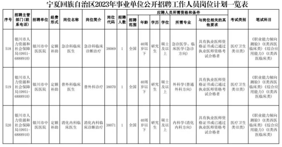 銀川市中醫(yī)醫(yī)院本次招聘3個崗位,招聘工作人員3人。招聘崗位、資格條件詳見《寧夏回族自治區(qū)2023年事業(yè)單位公開招聘工作人員崗位計(jì)劃一覽表》(序號518-520:銀川市中醫(yī)醫(yī)院)。