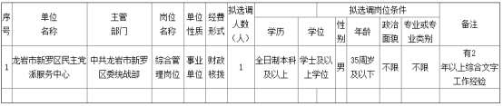 根據(jù)《事業(yè)單位人事管理?xiàng)l例》等有關(guān)規(guī)定,現(xiàn)將2023年中共龍巖市新羅區(qū)委統(tǒng)戰(zhàn)部公開選調(diào)工作人員有關(guān)事項(xiàng)公告如下: