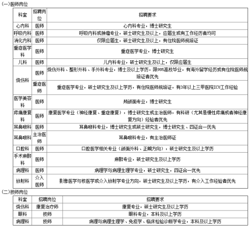 1.優(yōu)先錄用博士、具備三甲醫(yī)院相關(guān)工作經(jīng)歷者,臨床8年制博士可不受專業(yè)限制,應(yīng)聘各科室。