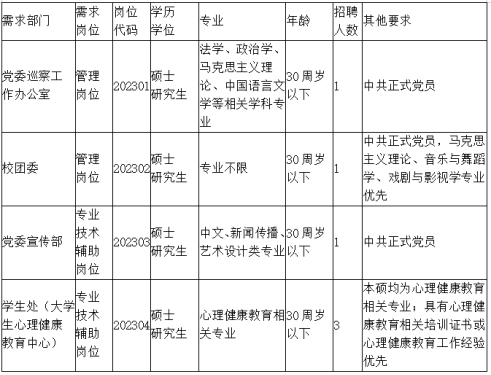 4.崗位需要的其他相關(guān)材料。報考202301,202302,202303崗位的考生須提供黨組織出具的中國共產(chǎn)黨正式黨員證明或中國共產(chǎn)黨黨員證;報考202304崗位的考生提供心理健康教育相關(guān)培訓(xùn)證書,有相關(guān)工作經(jīng)歷的須提供單位人事部門出具的心理健康教育工作經(jīng)歷證明;現(xiàn)編制內(nèi)人員報考時須按干部人事管理權(quán)限提供單位和主管部門同意報考的證明;