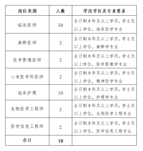 A類(lèi)崗位:30名,不設(shè)具體崗位及崗位聘用人數(shù)。全日制碩士研究生及以上學(xué)歷學(xué)位(根據(jù)《教育部辦公廳等五部門(mén)關(guān)于進(jìn)一步做好非全日制研究生就業(yè)工作的通知》(教研廳函〔2019〕1號(hào))文件精神,自2017年起參加研究生國(guó)家統(tǒng)招,考試招生執(zhí)行相同政策和標(biāo)準(zhǔn)的研究生不作全日制要求)、“雙一流”建設(shè)高校全日制本科及以上學(xué)歷學(xué)位、最新一輪學(xué)科評(píng)估為A-全日制本科及以上學(xué)歷學(xué)位。臨床醫(yī)學(xué)類(lèi)、口腔醫(yī)學(xué)類(lèi)、醫(yī)學(xué)技術(shù)類(lèi)、護(hù)理學(xué)類(lèi)、藥學(xué)類(lèi)、針灸推拿學(xué)、康復(fù)治療學(xué)、生物醫(yī)學(xué)工程、醫(yī)學(xué)信息工程等醫(yī)療醫(yī)技相關(guān)專(zhuān)業(yè)。