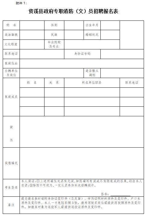 凡符合條件、有意應(yīng)聘者,可將報(bào)名表(附件1)、個(gè)人簡(jiǎn)歷、戶口簿、身份證復(fù)印件、學(xué)歷證書、榮譽(yù)證書、職業(yè)資格證書、退出消防員證、退役證等證件材料投至資溪縣消防救援大隊(duì)郵箱(1139960026@qq.com),或持本人報(bào)名表(附件1)、個(gè)人簡(jiǎn)歷、身份證、戶口簿、學(xué)歷證書、榮譽(yù)證書、職業(yè)資格證書、退出消防員證、退役證學(xué)歷證等證件材料和近期1寸正面免冠紅底彩色照片1張到資溪縣消防救援大隊(duì)(資溪縣飛鶴大道公安消防大隊(duì))報(bào)名。