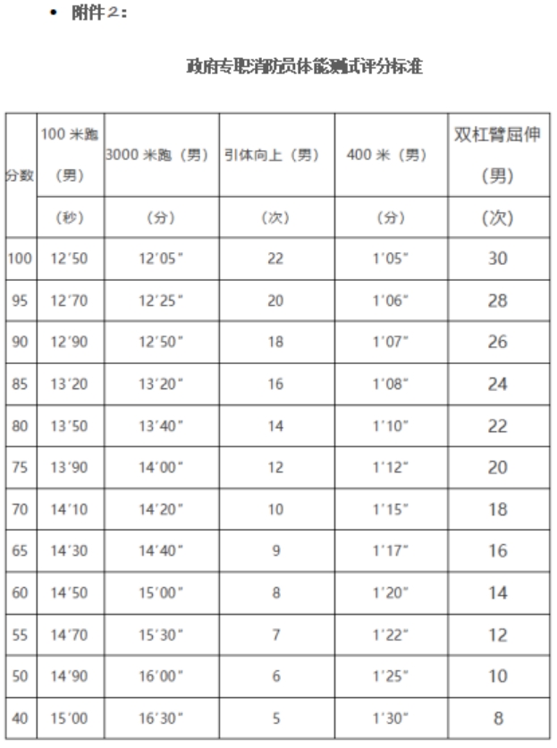 (1)體能測(cè)試:政府專職消防員考核內(nèi)容為3000米、單杠引體向上、100米、400米、雙杠臂屈伸等五個(gè)項(xiàng)目,每個(gè)科目占比20%,按照每項(xiàng)得分乘20%,確定單項(xiàng)科目成績(jī),總分100分.(附件2)
