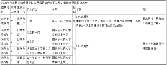 此次政府專職消防隊(duì)員、消防文員具體招聘崗位及學(xué)歷、專業(yè)相關(guān)要求詳見《2023年南皮縣消防救援大隊(duì)公開招聘政府專職消防隊(duì)員、消防文員崗位信息表》(附件1)。