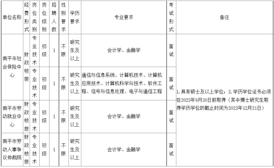 本次計(jì)劃招聘緊缺急需專業(yè)人員4名,其中南平市社會保險(xiǎn)中心2名、南平市勞動就業(yè)中心1名、南平市勞動人事爭議仲裁院1名。有關(guān)條件要求如下: